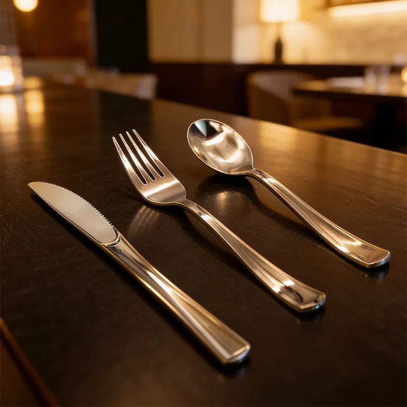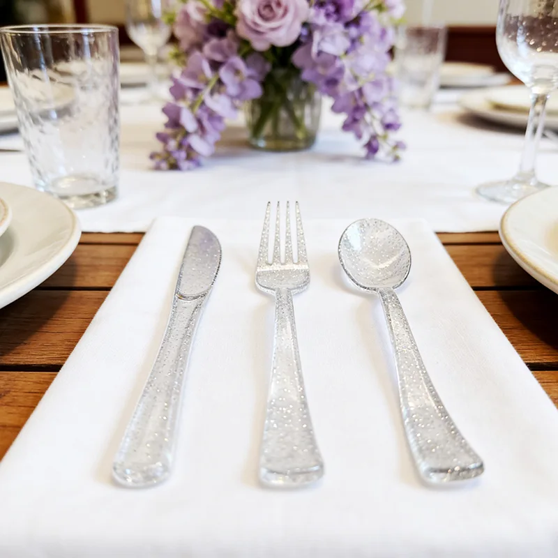 Berbanding dengan pinggan mangkuk pakai buang biasa dan pinggan mangkuk logam tradisional, Pisau Parti Klasik Garpu Sudu Kutleri Plastik menonjol dari segi tekstur. Permukaan produk telah menjalani rawatan khas, mencapai kilauan yang setanding dengan logam. Model berwarna metalik memancarkan suasana yang halus dan elegan, manakala model lutsinar pula bersih dan telus, benar-benar memecahkan kesan murah peralatan makan pakai buang. Dari segi reka bentuk, pinggan mangkuk menampilkan garisan licin dan teratur, mengintegrasikan keindahan dan kepraktisan dengan sempurna.